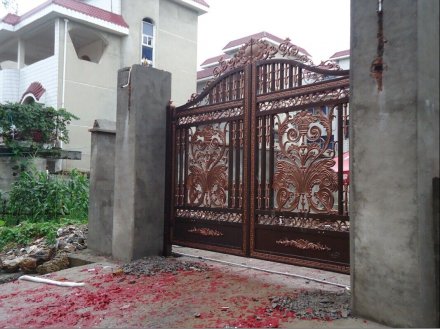 不要經(jīng)常用有水漬(或其他溶液)的手打開門鎖,以免其變色。在打開或轉(zhuǎn)動門鎖把手時,不要用力過猛,這樣會降低門鎖的使用壽命。合頁、門鎖等常用五金,一旦松動,應(yīng)立即擰緊.當門鎖打開不正常時,可在鎖孔內(nèi)加入適量的鉛筆沫,切記用食用油等物品潤滑。, 漆面出現(xiàn)結(jié)皮或粗?,F(xiàn)象時,應(yīng)采取過濾措施,以免刷漆后漆膜不平整,堵塞噴槍。, 4、廠家的生產(chǎn)加工工藝:正規(guī)廠家生產(chǎn)的別墅鋁藝大門,其加工比較精細,切線流暢、角度一致,在拼接過程中應(yīng)該不會出現(xiàn)較明顯的縫隙,密封性能好,開關(guān)順暢。劣質(zhì)的庭院別墅大門,特別是鋁合金室外產(chǎn)品如果加工不合格,會出現(xiàn)密封性質(zhì)問題,不僅漏風漏雨,而且在強風和大的外力的作用下,玻璃會出現(xiàn)炸裂、脫落現(xiàn)象,從而給業(yè)主造成損失財物甚至傷人的現(xiàn)象。, 為保持鋁藝院門的原色,需對鋁藝院門進行兩次以上的磷化處理,在其表面形成一層保護膜,浸泡數(shù)分鐘,這之后還要經(jīng)過噴涂保護漆、230℃烘干、自然冷卻等步驟,才能完成一戶完整的鋁藝院門的表面色彩亮感。生產(chǎn)工藝,除油除銹除氧化-水洗-酸洗-拋光-水洗-中和-水洗-著色處理-洗滌-干燥及其他后處理。, 3、沖孔制作的,安裝比較簡單;